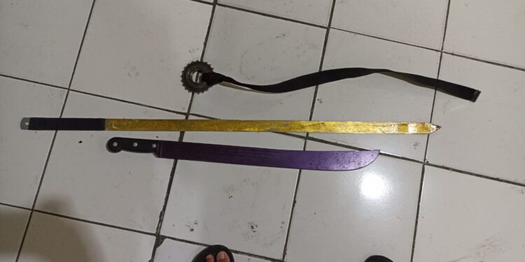 Tangerang – bedanews.com – Petugas kepolisian Polsek Ciledug mengamankan 12 orang remaja yang diduga hendak tawuran di Jalan Sukarela Kelurahan Peninggilan, Kecamatan Ciledug, Kota Tangerang. Polisi menyebut dua bilah senjata tajam jenis pedang dan sabuk/ikat pinggang gear disembunyikan di semak-semak tidak jauh dari lokasi para remaja itu berkumpul.