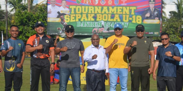 Merauke, bedanews.com — Komandan Korem 174/Anim Ti Waninggap Brigjen TNI E. Reza Pahlevi, S.E., membuka turnamen sepakbola Piala Danrem Cup yang diikuti 19 Tim U-18 dalam rangka HUT ke- 18 Korem 174/ATW dan memperingati Hari Juang TNI AD, berlangsung di lapangan sepak bola Makodim 1707/Merauke Provinsi Papua Selatan, Jumat (16/12/2022).