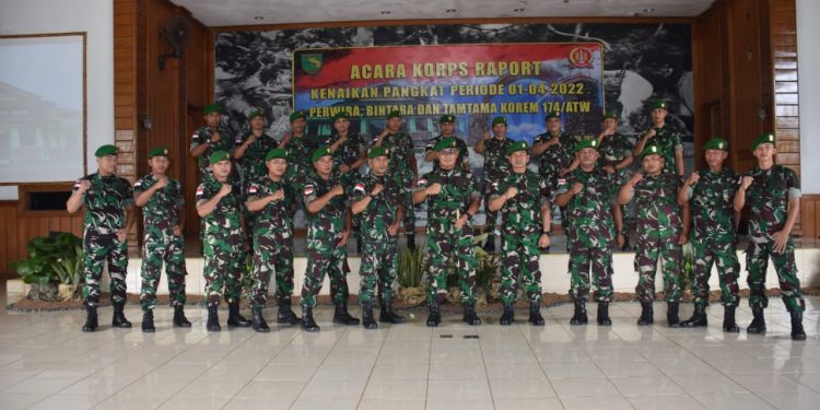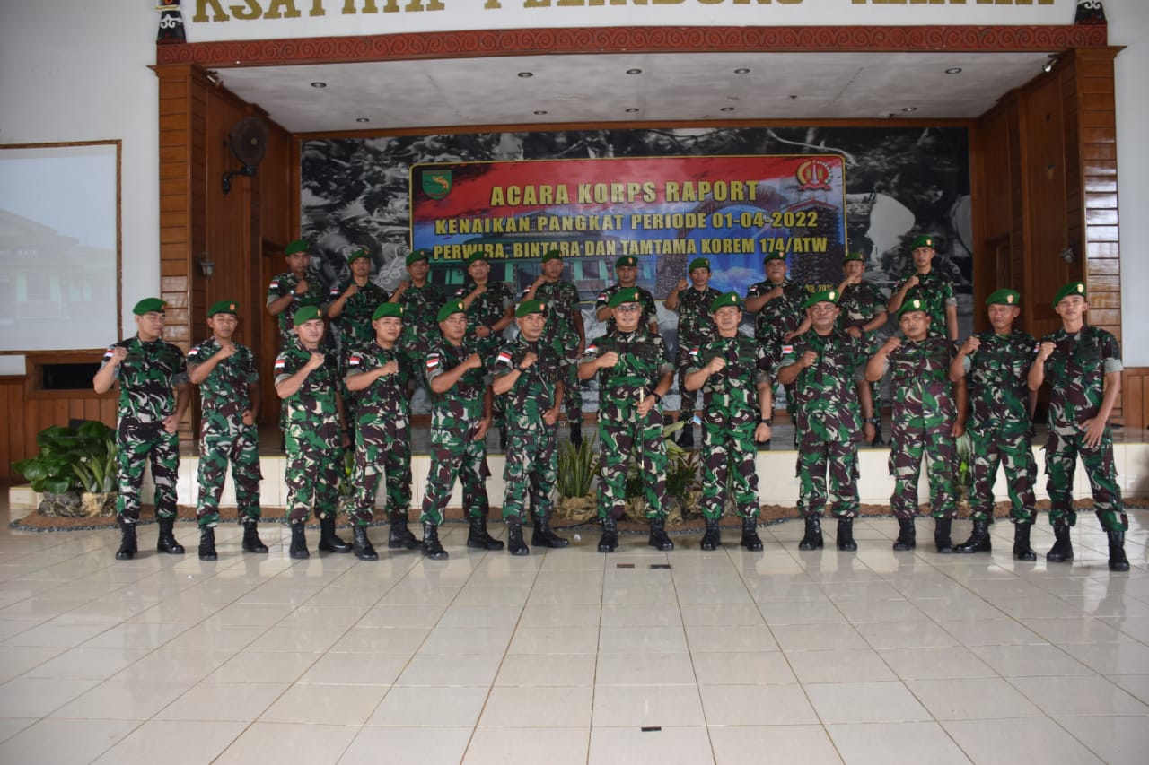 Acara Korps Raport kenaikan pangkat prajurit Korem terdiri dari Perwira, Bintara dan juga Tamtama, dilaksanakan di Aula L.B. Moerdani Korem 174/ATW dengan tetap mematuhi protokol kesehatan Covid-19, Jum’at (01/04/2022).