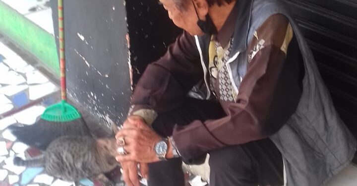 Teks foto-Heddi Ucup (84), saat memberi makan kucing liar (kucing lokal). (Foto Ist).