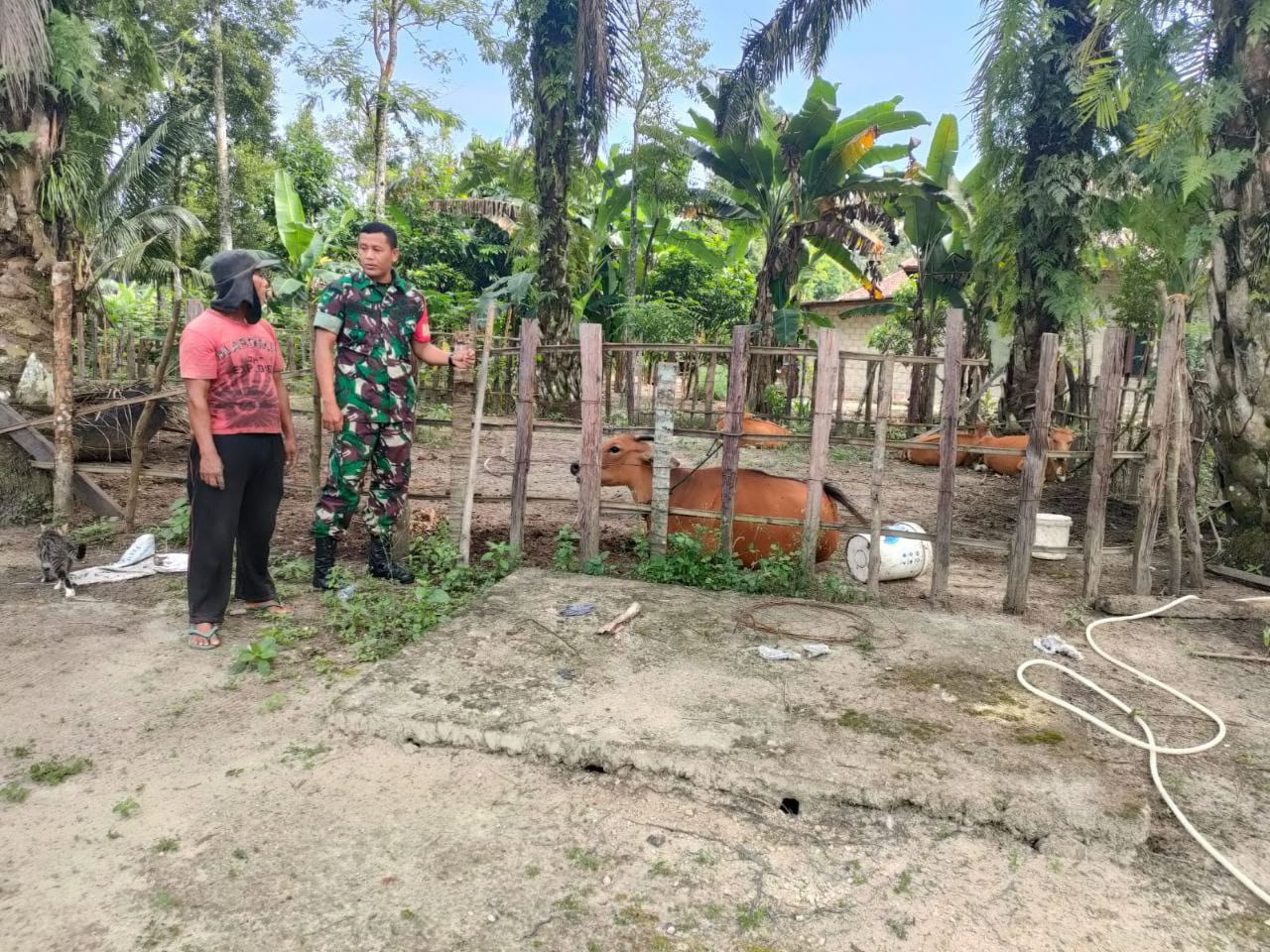 Sebagai langkah antisipasi penyebaran wabah Penyakit Mulut dan Kuku (PMK) pada hewan ternak Anggota Koramil 02/Kuantan Tengah Serda Marizal,As terus melaksanakan pemantauan, Pengecekan Kesehatan hewan ternak, dan sosialisasi terhadap pemilik ternak warga di Desa Teratak Air Hitam Kec. Sentajo Raya Kab. Kuansing, Senin (04/08/2025).
