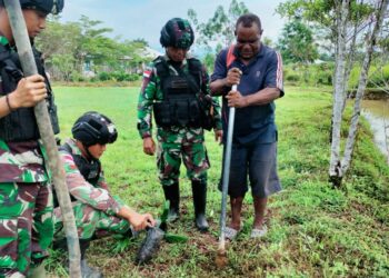 Yalimo - bedanews.com - Satgas Pamtas Yonif Raider 142/KJ melalui Pos Kotis Elelim melakukan kegiatan tanam bibit pinang yang...