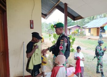 Keerom - bedanews.com - Personel Pos Yuruf Satgas Pamtas Yonif 126/KC memberikan pakaian layak pakai kepada masyarakat Kampung Jifangri, Distrik...