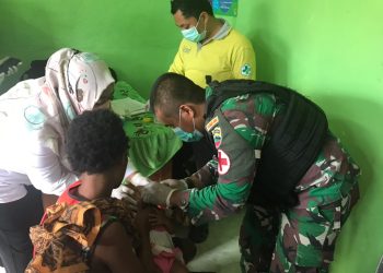 Keerom - bedanews.com - Prajurit Satgas Pamtas RI-PNG Yonif 126/Kala Cakti Pos Waris bantu para Tenaga Kesehatan (Nakes) Puskesmas Model...