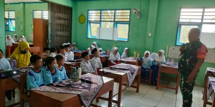 Pandak – Babinsa Gilangharjo Koramil 16/ Pandak Kodim 0729 Bantul Serda Mulyono mengajarkan materi wawasan kebangsaan kepada siswa Sekolah Dasar Muhammadiyah Kadisoro 2 Kalurahan Gilangharjo Kapanewon Pandak.