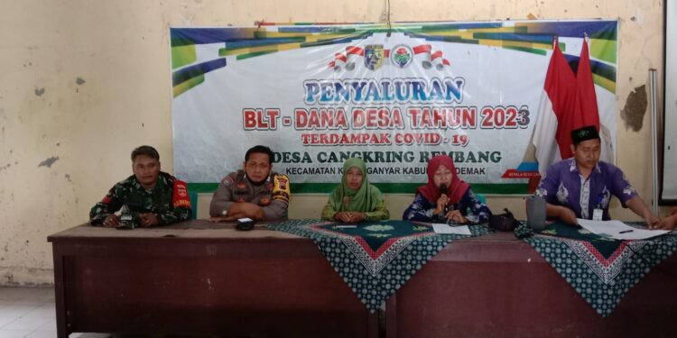 Demak – bedanews.com – Babinsa Koramil 08/Karanganyar, Kodim 0716/Demak, Kopka Hadi Cipto melaksanakan pendampingan sekaligus pengamanan penyaluran Bantuan Langsung Tunai (BLT) yang berasal dari Dana Desa di Balai Cangkring Rembang, Kecamatan Karanganyar, Rabu (29/03/23).