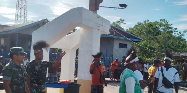 Timika, bedanews.com — Babinsa Koramil 1710-01/Kokonao, Kodim 1710/Mimika Serma Sinaga dan Serka Henrik mengawal arak-arakan Salib Indonesian Youth Day (IYD) yang tiba di Pelabuhan Atapo, Kokonao, Distrik Mimika Barat, Kab. Mimika, Minggu (23/04/2023).