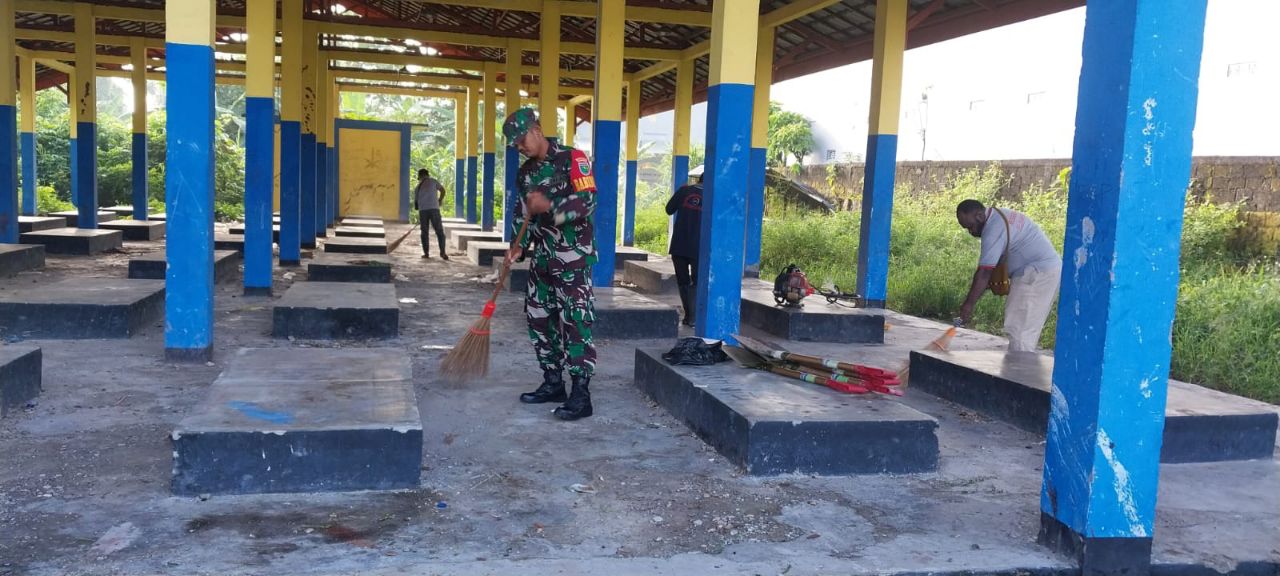 Babinsa Koramil 02/Timika Karya Bakti Pembersihan Pasar Bersama Masyarakat