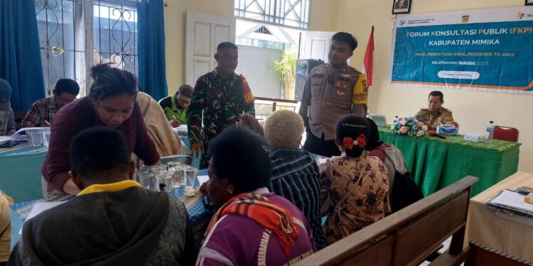 Timika, bedanews.com — Bertempat di Aula Kantor Kelurahan Inauga Distrik Wania, Kab. Mimika, Babinsa Koramil 1710-02/Timika Sertu Mathius Lipan menghadiri kegiatan Forum Konsultasi Publik (FKP) Badan Pusat Statistik (BPS) guna melaksanakan pendataan awal Registrasi Sosial Ekonomi (Regsosek) TA.2023 yang bertujuan untuk memverifikasi tingkat sosial ekonomi masyarakat Kel. Inauga, Rabu (10/05/2023).