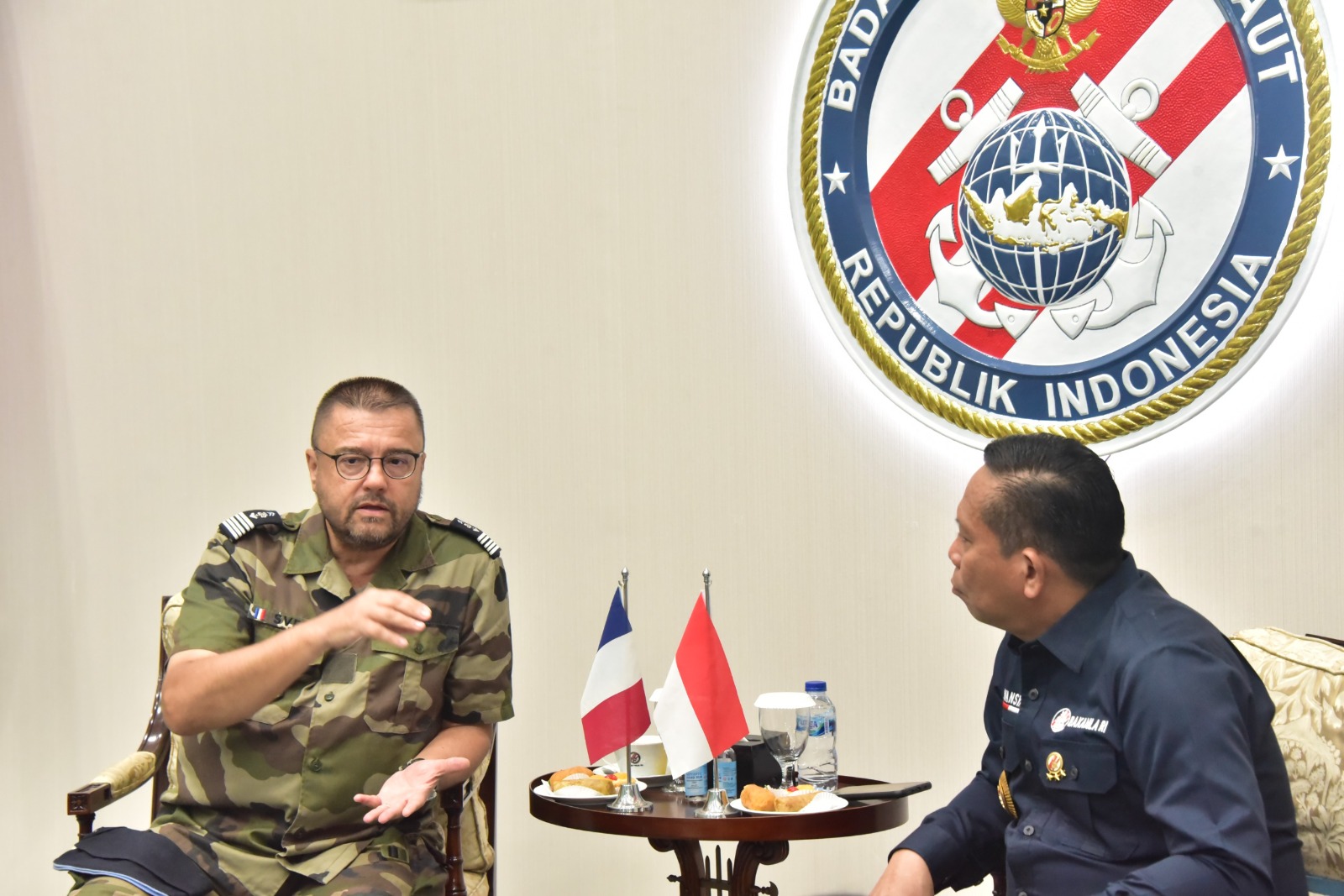 Jakarta – Kepala Bakamla RI Laksdya TNI Dr. Irvansyah, S.H., M.Tr.Opsla., menerima kunjungan kehormatan dari Atase Pertahanan Prancis Colonel Sven Meic serta Wakil Athan Lieutenant Colonel Olivier Cam. Pertemuan berlangsung di Aula Ary Hasibuan Mabes Bakamla RI, Jakarta Pusat, Kamis (22/02/2024).