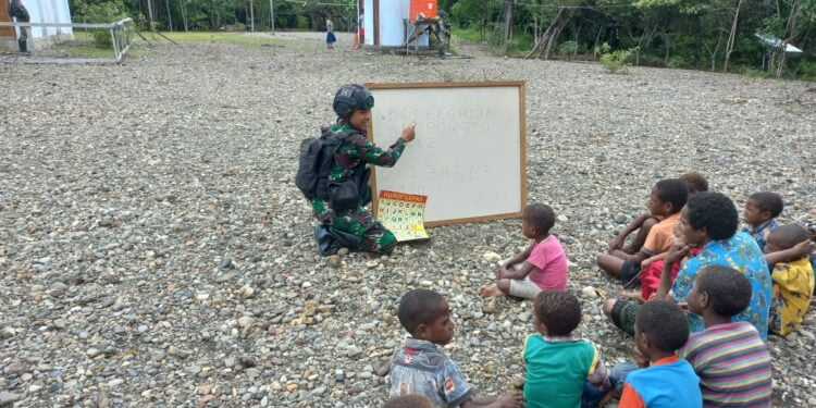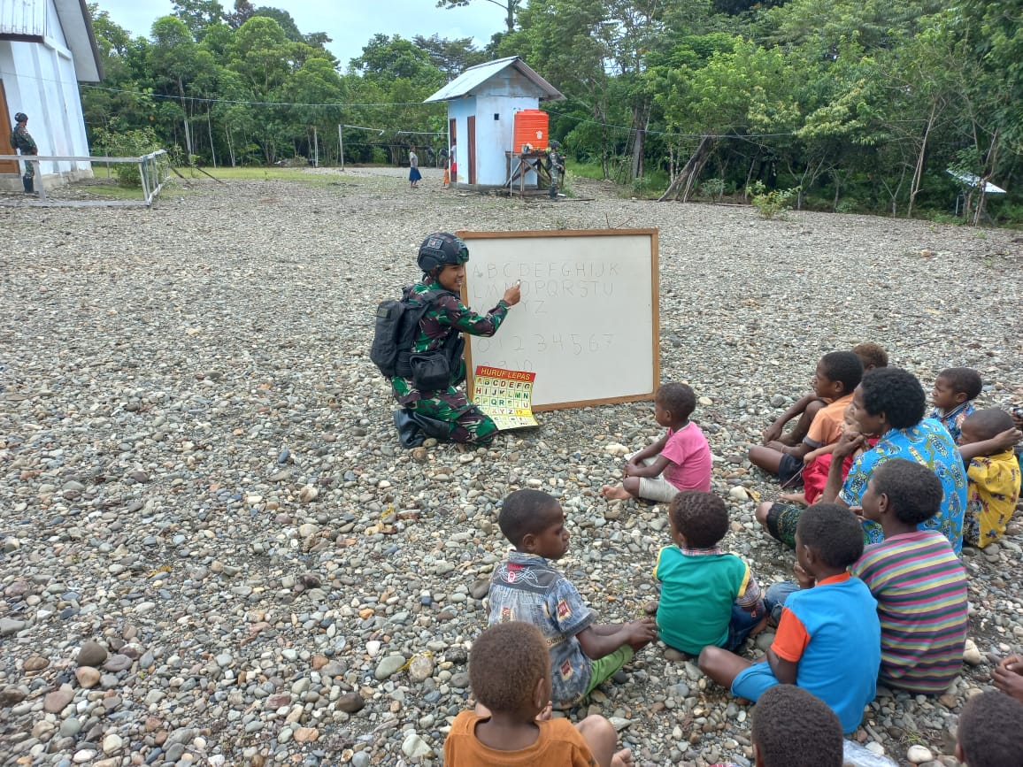 Yahukimo – bedanews.com – Guna membangun generasi muda Papua yang tangguh dan berpendidikan, banyak cara yang bisa dilakukan. Satgas Pamtas Yonif Raiderr 142/KJ memberikan pengajaran langsung kepada anak-anak berupa pengenalan huruf Alfabet dan angka-angka di Kampung Kekey, Distrik Dekay, Kab. Yahukimo, Papua, Senin (18/7/2022).
