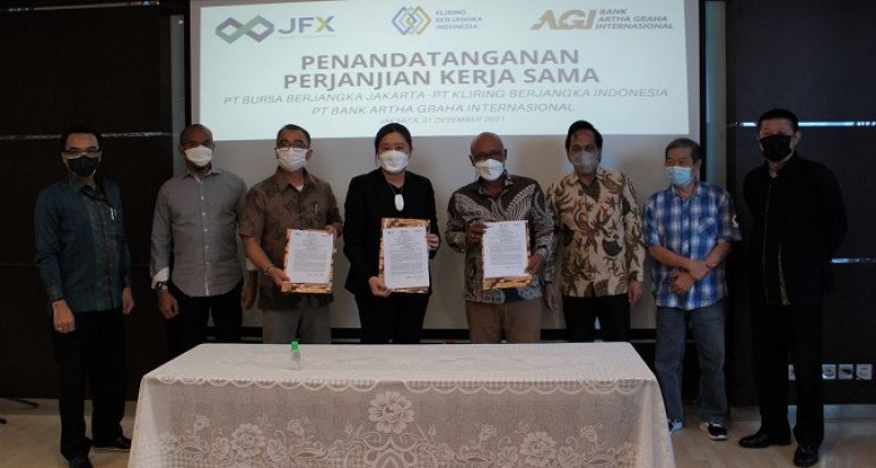 Jakarta – bedanews.com – Menutup rangkaian kegiatan selama tahun 2021, PT Bursa Berjangka Jakarta (JFX) bersama PT. Kliring Berjangka Indonesia (KBI) (Persero) serta PT. Bank Artha Graha Internasional Tbk menandatangani Perjanjian Kerja Sama terkait Penggunaan Jasa Teknologi Keuangan dalam Transaksi Perdagangan Pasar Fisik Emas Digital di Kantor Bursa Berjangka Jakarta, Gedung The City Tower.