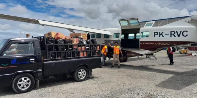 Jakarta – Pendistribusian Bansos untuk warga yang terdampak Gagal Panen di Distrik Agandugume dan Distrik Lambewi Kab. Puncak terus dilakukan. Tiga Ribu dua ratus lima puluh kilogram kilogram Bansos Panglima TNI diangkut dari Lanud Yohanis Kapiyau (YKU) Timika menuju Sinak Kabupaten Puncak Papua, Senin (31/7/2023). Berarti 8.000 kg Bansos dari Panglima berhasil dituntaskan pendistribusiannya.