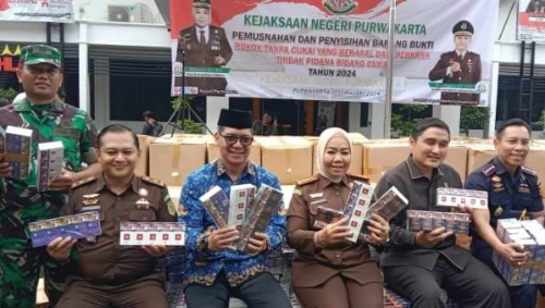PURWAKARTA, BEDAnews – Pemusnahan barang bukti rokok illegal (tanpa cukai) dari Tindak Pidana di Bidang Cukai dengan rincian sebanyak 73.440 puluh tiga ribu empat ratus empat puluh batang sigaret merek ST PREMIUM: 3.600 (tiga ribu enam ratus) batang sigaret merek ESYC PREMIUM, 92.000 (sembilan puluh dua ribu batang sigaret merk M sebanyak 59.800 [lima puluh sembilan ribu delapan ratus) batang sigaret merk JUST barang bukti perkara atas nama ARIF HARTANTO Bin ANAN SUYANTO (Aim) atas dasar putusan pengadilan nomor: 182/Phd Sus/2023/PN Pak, tanggal 28/12/2023 di halaman kantor Kejaksaan Negeri Purwakarta, langsung di pimpin Kepala Kejaksaan Rohayatie, Rabu (17/1/2024).