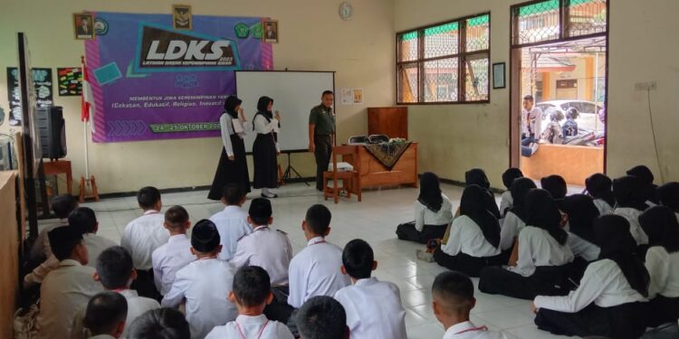 Pacitan – bedanews.com – Sebanyak 46 anggota Osis dari sekolah MTSN 3 Punung Kab. Pacitan menerima pembekalan materi kepemimpinan dari Pelda Arianto, Bati Wanmil Koramil 0801/10 Punung Kodim 0801/Pacitan, Selasa (24/10/2023).