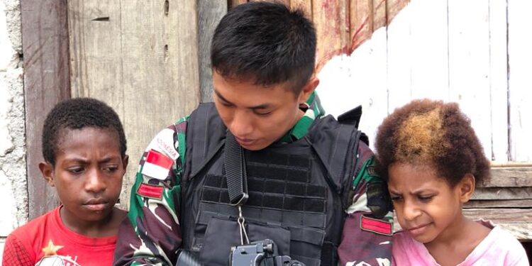 Keerom – bedanews.com – Personel Satgas Pamtas RI-PNG Yonif 126/KC Pos Kalipao berinteraksi dalam bentuk cerita dan berbagi buku kepada anak-anak di Kampung Yuwainda, Distrik Waris, Kabupaten Keerom.
