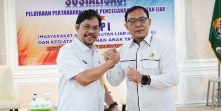 SINERGITAS-Kepala Kantor ATR/BPN Karawang, Nurus Sholichin, A.Ptnh, MM Salam Komando dengan Endang Agustian, Dewan Pembina MAPI usai acara. (Foto Ist).