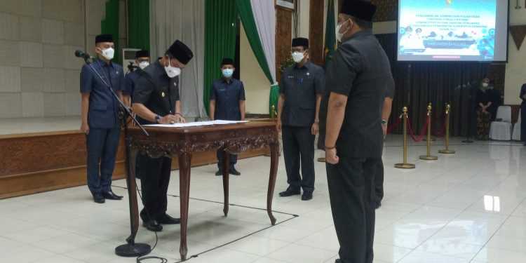 KAB. BANDUNG — Bupati Bandung H. M. Dadang Supriatna (Kang DS), hari ini, Kamis 11 November 2021, di Gedung Moch. Toha, melantik 80 0rang pejabat dilingkungan Pemerintah Kabupaten Bandung, dan merotasi 4 (empat) pejabat esselon II dari jumlah keseluruhan.