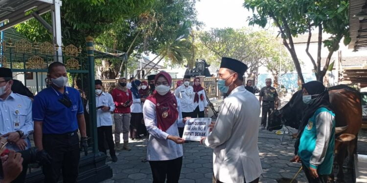 Demak – bedanews.com – Ketua Takmir Masjid Agung Demak, KH. Abdullah Syifa menerima hewan qurban berupa sapi untuk Hari Raya Idul Adha 1443 H dari Bupati Demak, dr. Hj. Eisti’anah dan Wakil Bupati, KH Ali Makhsun disaksikan Pj Sekda, Eko Pringgolaksito, Para Asisten Sekda serta Plt Kepala Dinas Pariwisata Kabupaten Demak, Endah Cahyarini di Halaman Masjid Agung Demak, Jum’at (8/7).