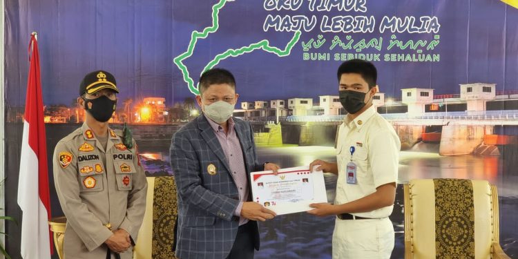 OKU TIMUR – Bupati OKU Timur H. Lanosin, S.T. menyerahkan piagam penghargaan dan tali kasih kepada 40 Paskibraka dan 30 kepada Panitia, Tim Kesehatan dan PPI yang bertugas dalam  HUT RI Ke-76 Tahun 2021 di Balai Rakyat Setda OKU Timur. Senin, (11/10 2021).