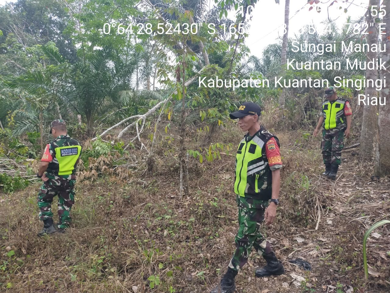Babinsa Koramil 08/KM Kodim 0302/Inhu Serda Gusman bersama 3 orang anggota Lainnya melaksanakan kegiatan patroli pencegahan kebakaran hutan dan lahan (karhutla) Di Desa Sungai Manau kecamatan Kuantan mudik kabupaten Kuantan Singingi. Kamis (10/07/2025).