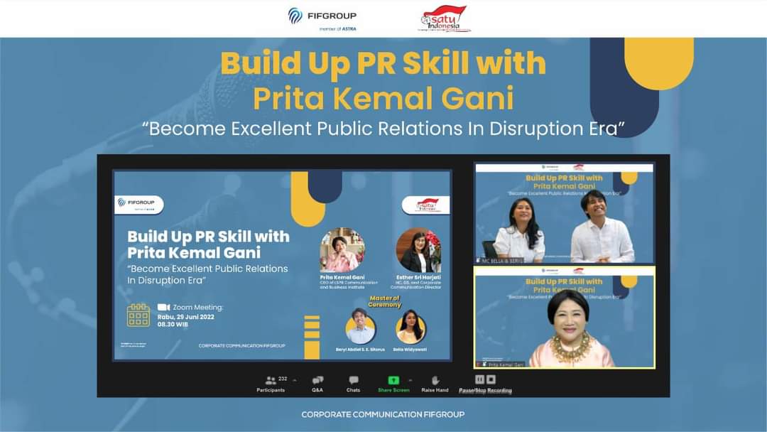“Perusahaan excellent memiliki PR yang unggul”, begitulah kalimat pembuka yang disampaikan oleh salah satu tokoh berpengaruh dalam dunia PR atau hubungan masyarakat (humas) di Indonesia, yaitu Prita Kemal Gani di dalam acara Webinar Build Up PR Skill with Prita Kemal Gani bertajuk “Become Excellent Public Relations in Disruption Era” yang diselenggarakan oleh PT. Federal International Finance (FIFGROUP).