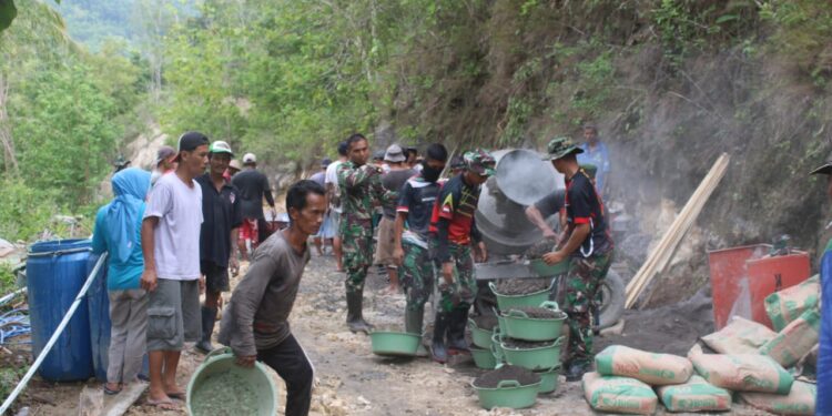 Bantul – Anggota Satgas TNI manunggal Membangun Desa (TMMD) Reg 119 Kodim 0729 Bantul terus kebut pekerjaan sasaran fisik rabat beton jalan di Program TMMD Reg 119 Kodim 0729 Bantul di Dusun Tangkil, Kal. Muntuk & Dusun Salam, Kalurahan Temuwuh, Kapanewon Dlingo, Kabupaten Bantul .