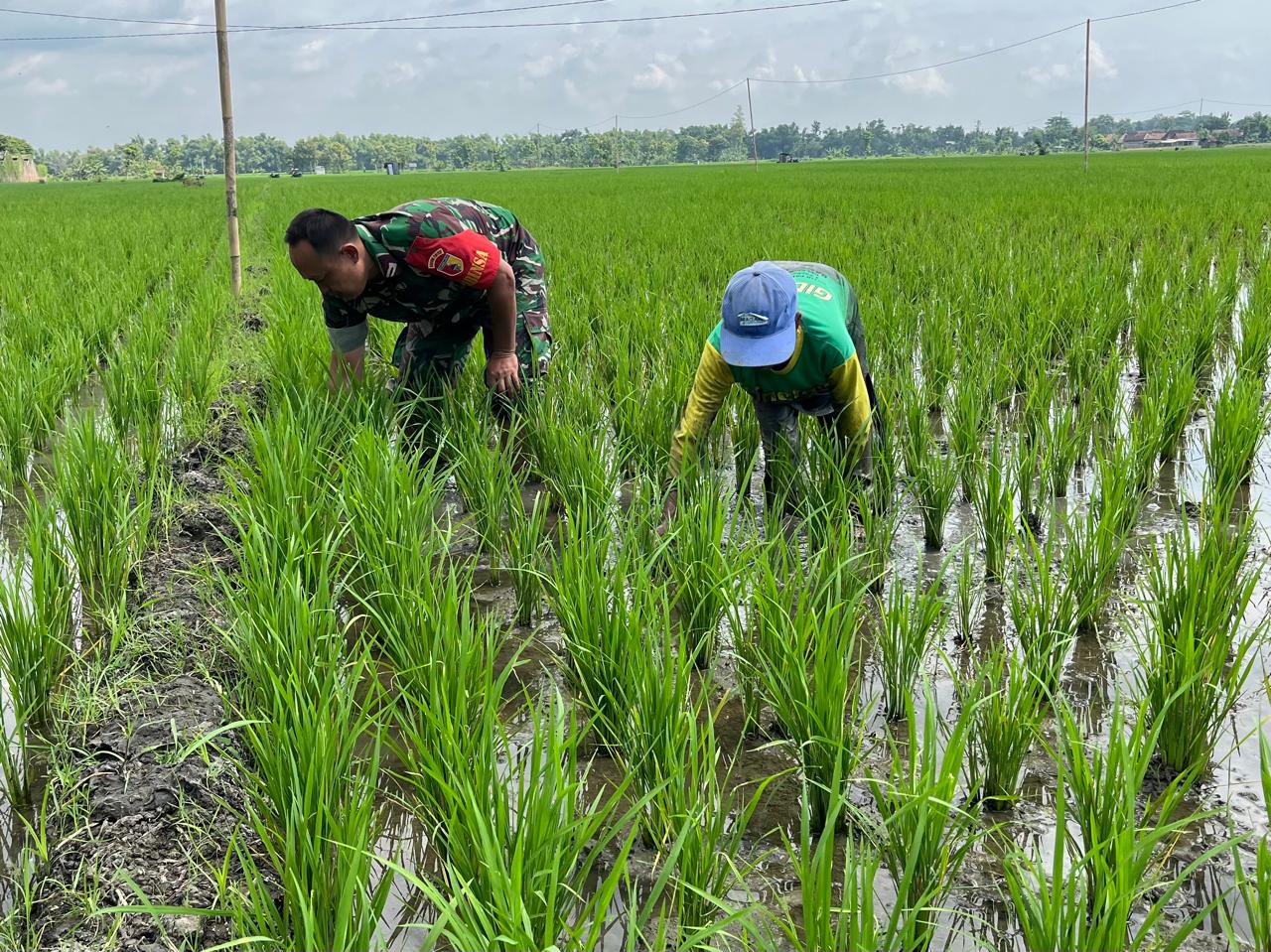 Pendampingan Han Pangan, Babinsa Kodim Ponorogo Bantu Petani Penyiangan Gulma Tanaman Padi