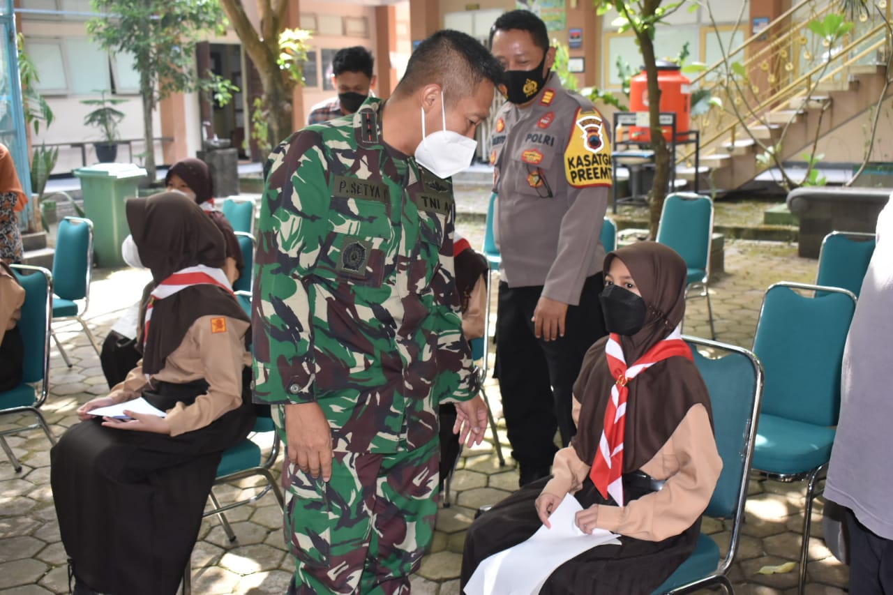 Dandim 0716/Demak, Letkol Czi Pribadi Setya Pratomo bersama jajaran Forkopimda Demak keliling ke sejumlah sekolah mengecek penerapan protokol kesehatan di SMP N 2 Demak dan SMA N 1 Demak, Jum’at (10/9/2021).