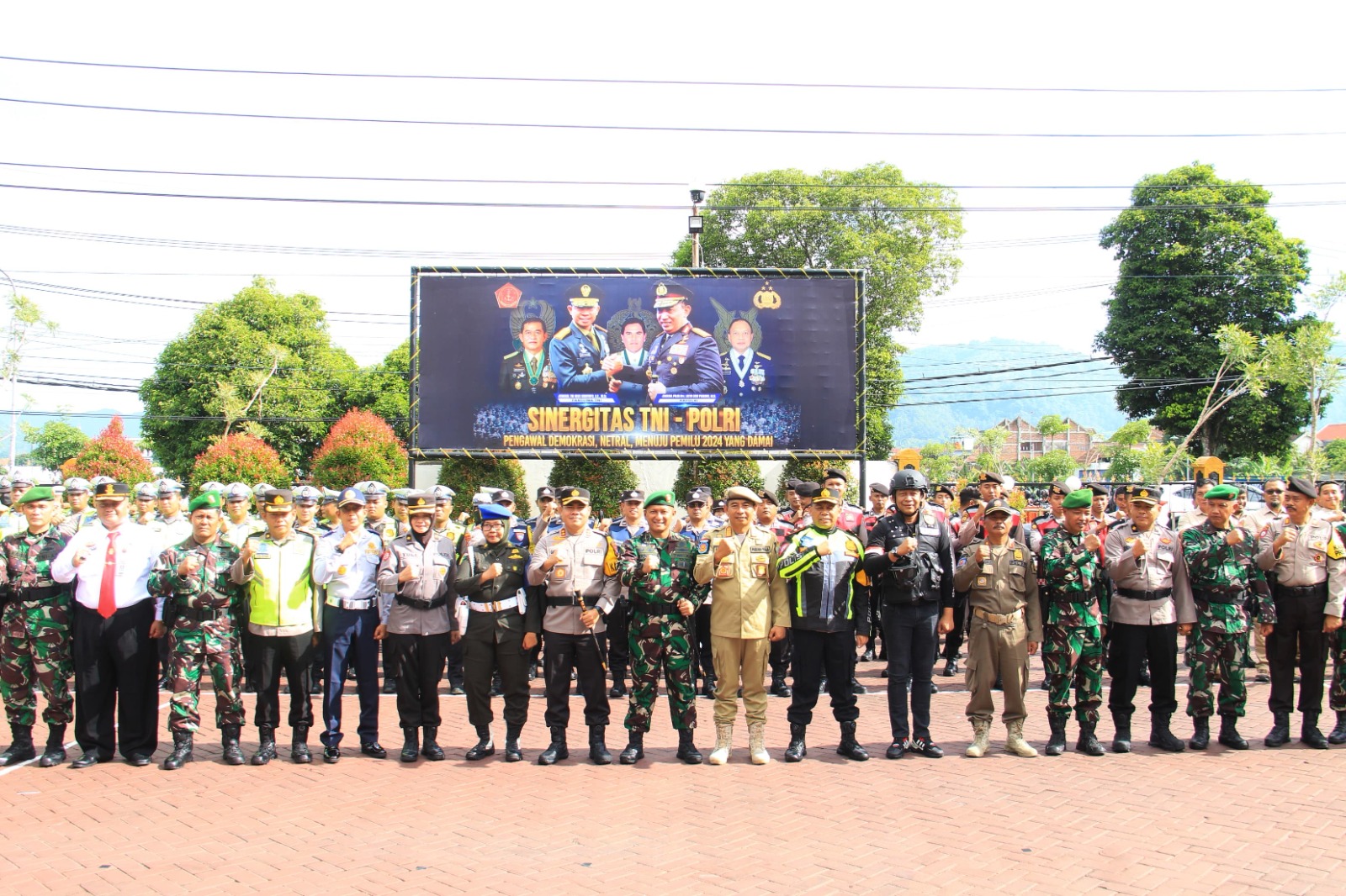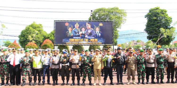 Trenggalek – bedanews.com – Dalam rangka memastikan kesiapan personel pengamanan terkait tahapan pemungutan suara dan penghitungan suara Pemilu Tahun 2024, Dandim 0806/Trenggalek, Letkol Czi Yudo Aji Susanto, S.Sos, M.A dan Kapolres Trenggalek, AKBP Gathut Bowo Supriyono, S.H, S.I.K, M.Si, bersatu padu memimpin kegiatan Apel Gabungan dan Patroli Skala Besar. Kegiatan ini dilaksanakan di lapangan Mapolres Trenggalek, Jl. Brigjend Sutran No.6, Kelurahan Ngantru, Kecamatan Trenggalek, Kabupaten Trenggalek, Selasa (6/2/2024).