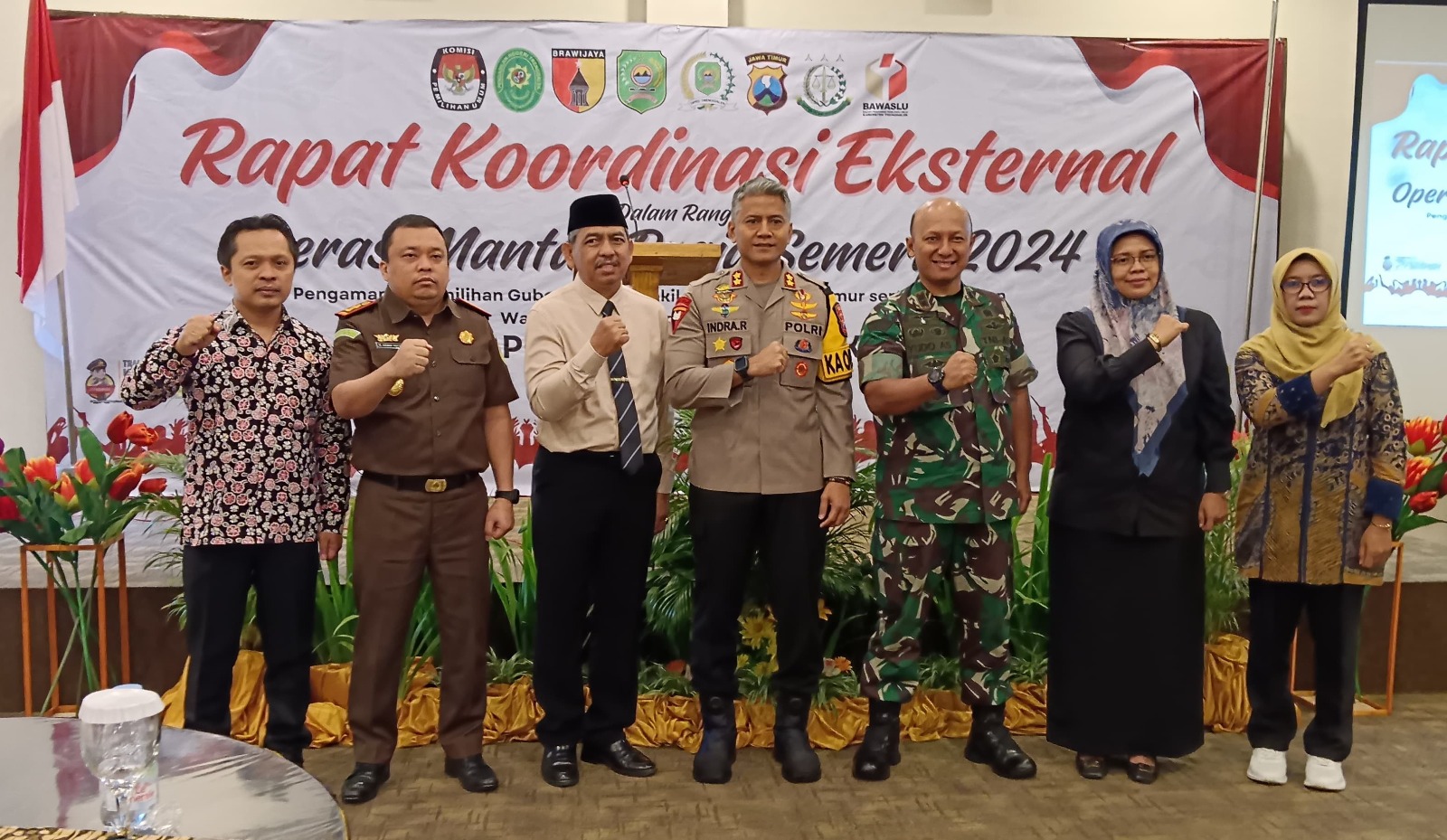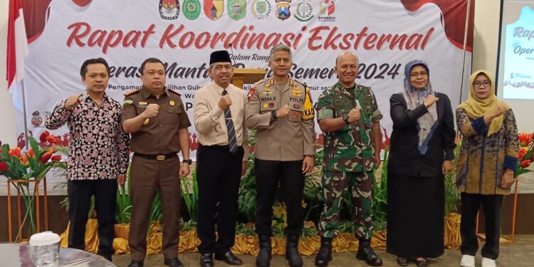 TRENGGALEK || Bedanews.com – Komandan Distrik Militer (Dandim) 0806/Trenggalek, Letkol Czi Yudo Aji Susanto, S.Sos, M.A, dengan tegas menyatakan komitmen tak tergoyahkan dari jajarannya dalam mendukung Polres Trenggalek. Beliau menegaskan bahwa, Kodim 0806 akan memainkan peran krusial dalam memastikan kesuksesan Pemilihan Kepala Daerah (Pilkada) 2024. Pernyataan ini disampaikan dalam Rapat Koordinasi (Rakor) Lintas Sektoral yang berlangsung di Hall Hotel Jaas Permai, Jum’at (16/8/2024).