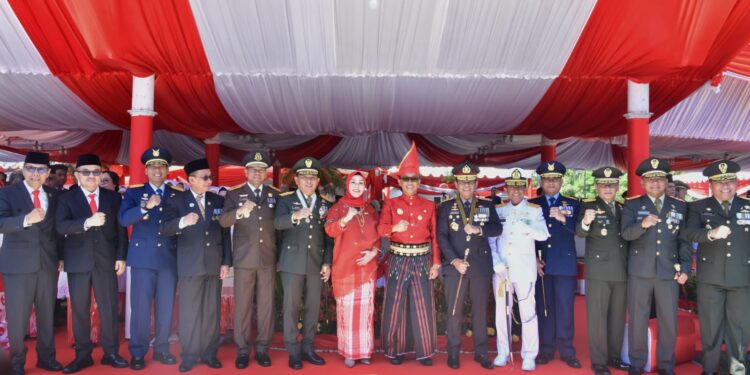 Makassar – Danlanud Sultan Hasanuddin Marsma TNI Bonang Bayuaji G., S.E., M.M., CHRMP., bersama Ketua PIA Ardhya Garini Cabang 7/D.ll, Ny. Liska Bonang Bayuaji, menghadiri Upacara Peringatan Hari Ulang Tahun (HUT) ke-79 Proklamasi Kemerdekaan Republik Indonesia yang digelar di Rumah Jabatan (Rujab) Gubernur Sulawesi Selatan, Sabtu (17/8/2024).
