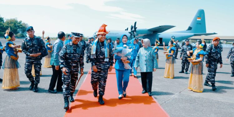 Makassar – Danlanud Sultan Hasanudin Marsma TNI Bonang Bayuaji G, S.E., M.M., CHRMP., didampingi Ketua PIA Ardhya Garini Cabang 7/D.II Lanud Sultan Hasanuddin Ny. Liska Bonang Bayuaji menyambut kedatangan Kepala Staf Angkatan Laut (Kasal) Laksamana TNI Dr. Muhammad Ali, S.E., M.M., M.Tr.Opsla., beserta Ketua Umum Jalasenastri Ny. Fera Muhammad Ali dan Rombongan saat melaksanakan kunjungan kerja di Makassar, bertempat di Apron Baseops Lanud Sultan Hasanuddin, Makassar, Provinsi Sulawesi Selatan, Jumat (9/8/2024).