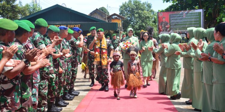 Merauke, bedanews.com — Danrem 174/ATW Brigjen TNI Agus Widodo, S.I.P., M.Si. didampingi Ketua Persit KCK Koorcab Rem 174 Ny. Ane Agus Widodo melaksanakan kunjungan kerja sekaligus memberikan pengarahan kepada Prajurit, PNS dan Persit KCK Cabang XVIII Kodim 1707/Merauke serta personel Denpom XVII/3 Merauke di Aula Anim Ha Makodim 1707/Merauke, Jln. Raya Mandala Distrik Merauke, Kab. Merauke, Provinsi Papua Selatan, Senin (20/3/2023).
