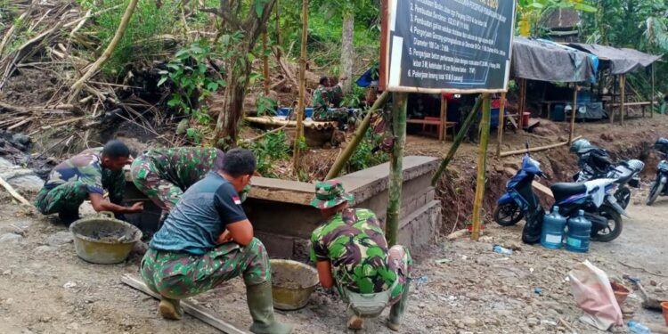 Perbukitan yang tinggi bukanlah halangan bagi satu Kompi Pasukan Gabungan TNI. Mereka terlihat berjibaku mulai dari pagi hingga sore hari mengangkut batu, semen dan pasir melalui medan yang cukup terjal dan licin saat diguyur oleh hujan pada Sabtu (16/03/2024) di Dusun Bukit Catu, Desa Selumbung, Kecamatan Manggis, Kabupaten Karangasem.