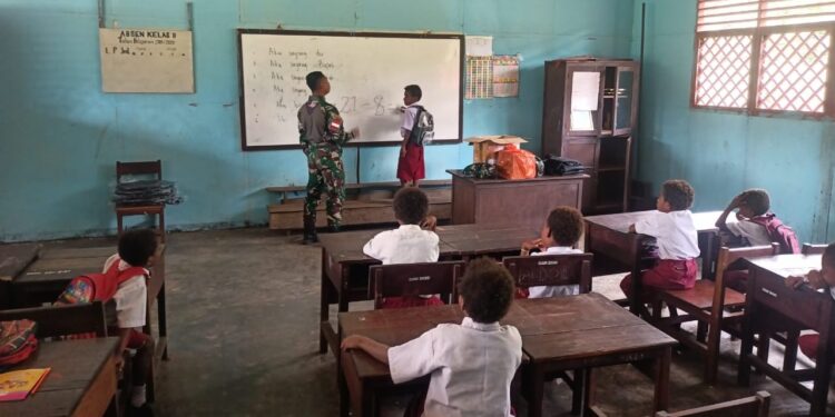 Merauke – Selain menjaga keamanan di wilayah perbatasan RI-PNG, personel Satgas Pamtas Yonif 726/Tamalatea juga membantu tenaga pendidik di sekolah yang masih sangat terbatas. Adapun pelajaran yang diberikan yaitu Calistung (membaca, menulis dan berhitung) bagi murid-murid di SD YPPK ST Mikael Kampung Kweel, Distrik Eligobel, Senin (04/03/2024).