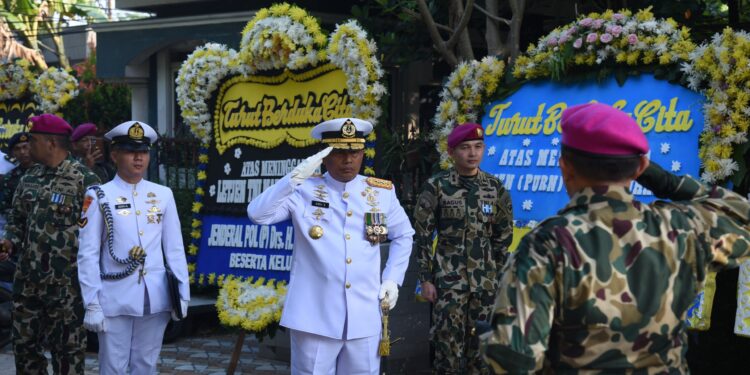 Jakarta || Panglima Korps Marinir (Pangkormar) Letnan Jenderal TNI (Mar) Dr. Endi Supardi, S.E., M.M., M.Tr.Opsla., CHRMP., CRMP. Memimpin langsung upacara militer persemayaman dan pemberangkatan jenazah almarhum Letnan Jenderal TNI Marinir (Purn) Suharto di rumah duka, Komplek TNI AL Kelapa Gading, Jakarta Utara, Minggu (19/04/2026).