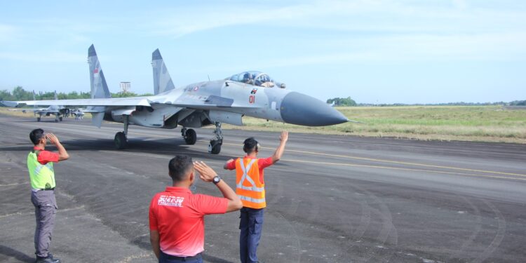 Makassar – Dua jet tempur Sukhoi dari Skadron Udara 11 Wing Udara 5 Lanud Sultan Hasanuddin dikerahkan untuk melakukan Combat Air Patrol (CAP) diwilayah udara pulau Dewata Bali dalam rangka mengamankan gelaran Indonesia Afrika Forum Ke-2 yang berlangsung dari tanggal 1-3 September 2024, Senin (2/9/2024).
