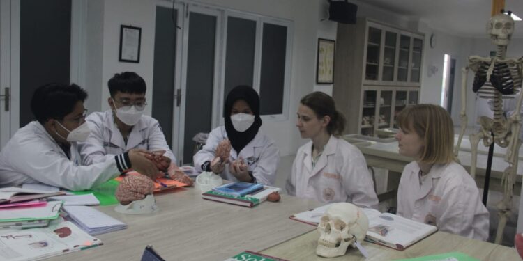Dekan Fakultas Kedokteran dr. H. Catur Setiya Sulistiyana, M.Med. Ed pada kesempatan ini menyerahkan dua mahasiswa student exchange dari Belanda, yang akan belajar di UGJ selama tiga bulan, yang sebelumnya diagendakan untuk Tour di kampus FK UGJ, melihat proses pembelajan, proses Skill Lab, PBL dan Praktikum Biomedis.