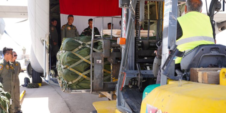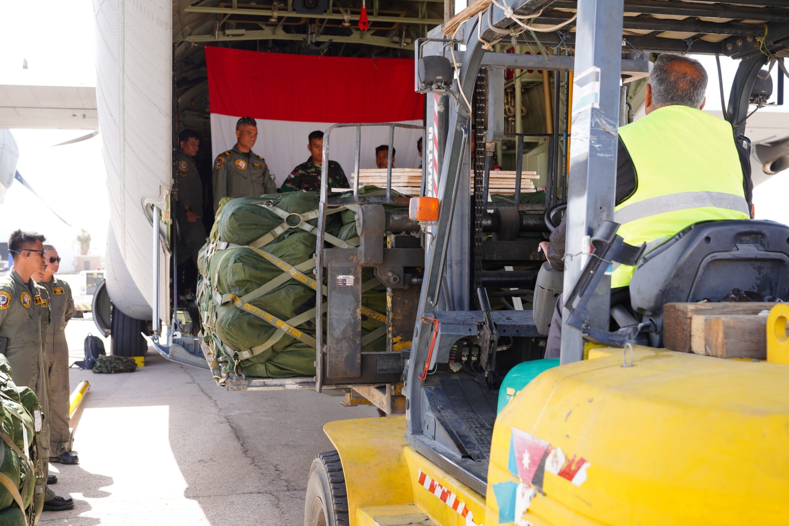 Jordania – Pesawat Hercules C130J yang yang dipimpin Kolonel PNB Noto Casnoto, S.T.M.Han sebagai Mission Commander dari pemerintah Indonesia yang membawa Payung Udara Orang (PUO) dan Payung Udara Barang (PUB) bantuan kemanusiaan dari pemerintah Indonesia untuk rakyat Palestina tiba di Bandar Udara Amman, Jordania, Minggu (31/03/2024)