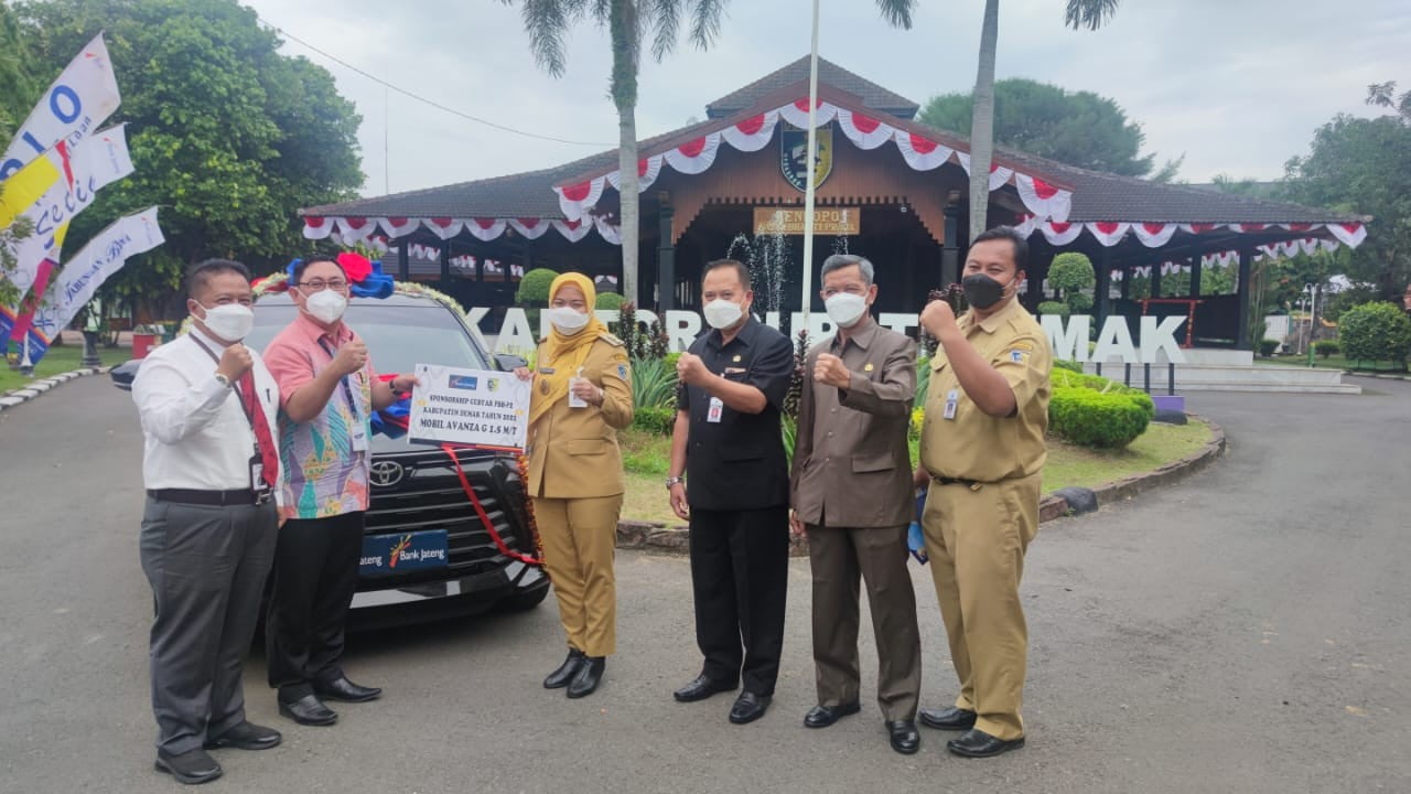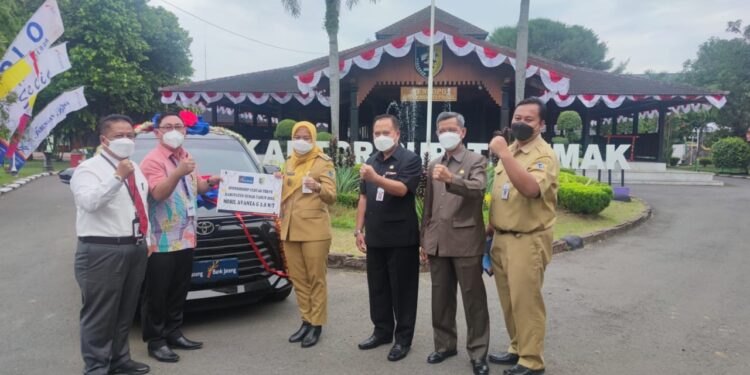 Demak – bedanews.com – Bupati Demak, dr. Hj. Eisti’anah menerima secara simbolis satu unit mobil Avanza G 1.5 M/T sebagai sponshorsip gebyar PBB-P2 (Pajak Bumi dan Bangunan Perdesaan dan Perkotaan) Kabupaten Demak Tahun 2022 dari Pemimpin Bank Jateng KC Demak, Adhi Setiawan di halaman Pendopo Satya Bhakti Praja, Senin (11/7/22).