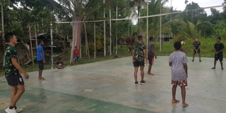 Seperti yang dilakukan oleh anak-anak Pos Bompay Satgas Yonif 143/TWEJ dalam rangka lebih mempererat jalinan komunikasi dan menjaga kebugaran tubuh mengajak para pemuda untuk olahraga bersama di Kampung Bompay, Distrik Waris, Kab. Keerom, Papua, Jum’at (23/6/2023).