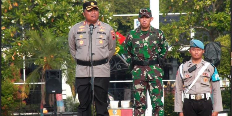 Demak – bedanews.com – Polres Demak bersama Kodim 0716/Demak menggelar Apel Jam Pimpinan TNI-Polri Jawa Tengah yang berlangsung di Alun-alun Simpang Enam Demak, Selasa (7/3/2023).