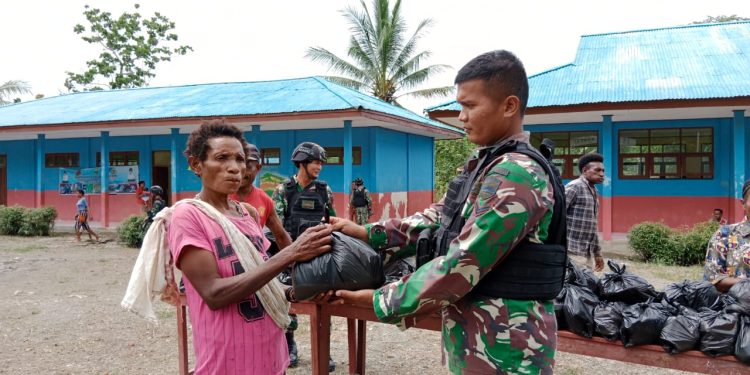 Keerom – bedanews.com – Sebagai wujud cinta kasih TNI kepada masyarakat perbatasan Papua, prajurit Pos Bompay Satgas Pamtas RI-PNG 126/KC menggelar bakti sosial pembagian paket sembako untuk masyarakat Kampung Bompay, Distrik Waris, Kabupaten Keerom.