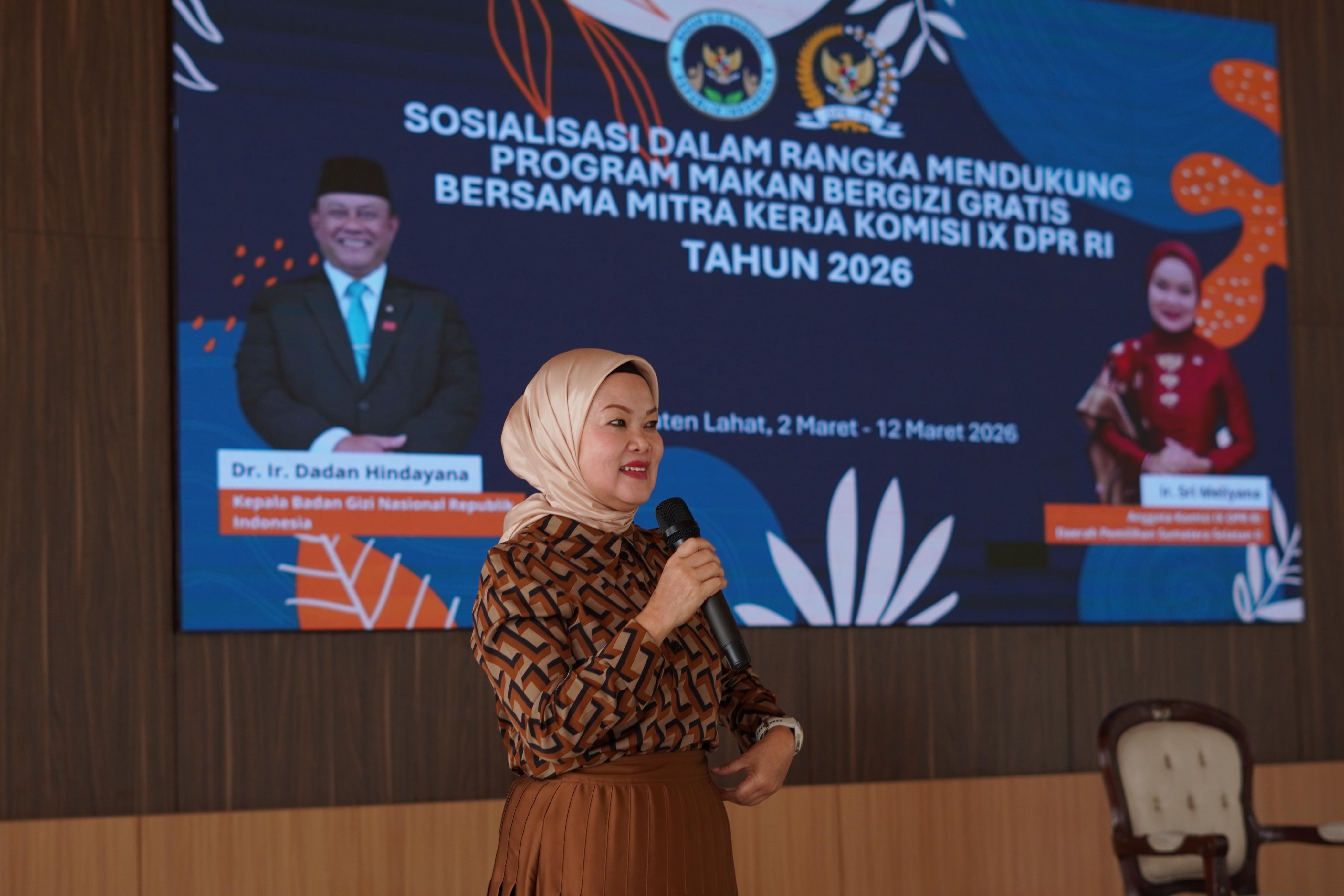 Kegiatan sosialisasi program MBG ini menghadirkan Anggota Komisi IX DPR RI, Sri Meliyana, Tenaga Layanan Operasional Deputi Bidang Promosi dan Kerja Sama Badan Gizi Nasional, Rahma Dewi Auliyasari, serta ratusan peserta yang merupakan warga setempat.