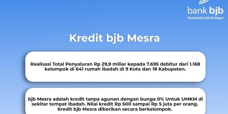 Hingga kini, sebanyak 7.695 debitur dari 1.168 kelompok di 9 Kota dan 18 Kabupaten dan 641 Rumah Ibadah telah merasakan Kredit bjb Mesra dengan outstanding Rp 29,9 miliar.