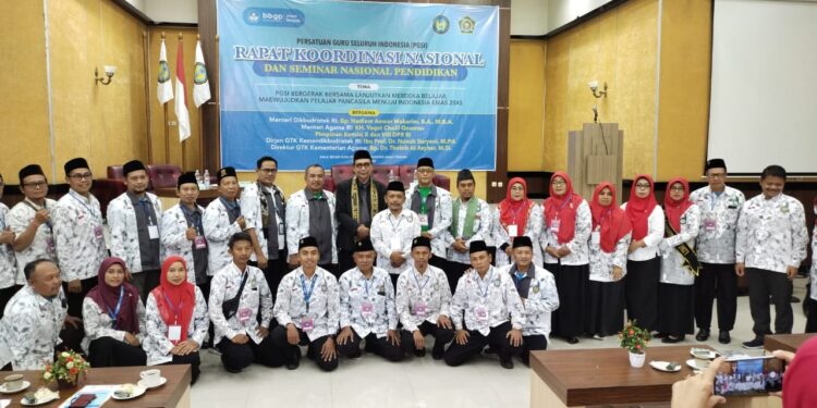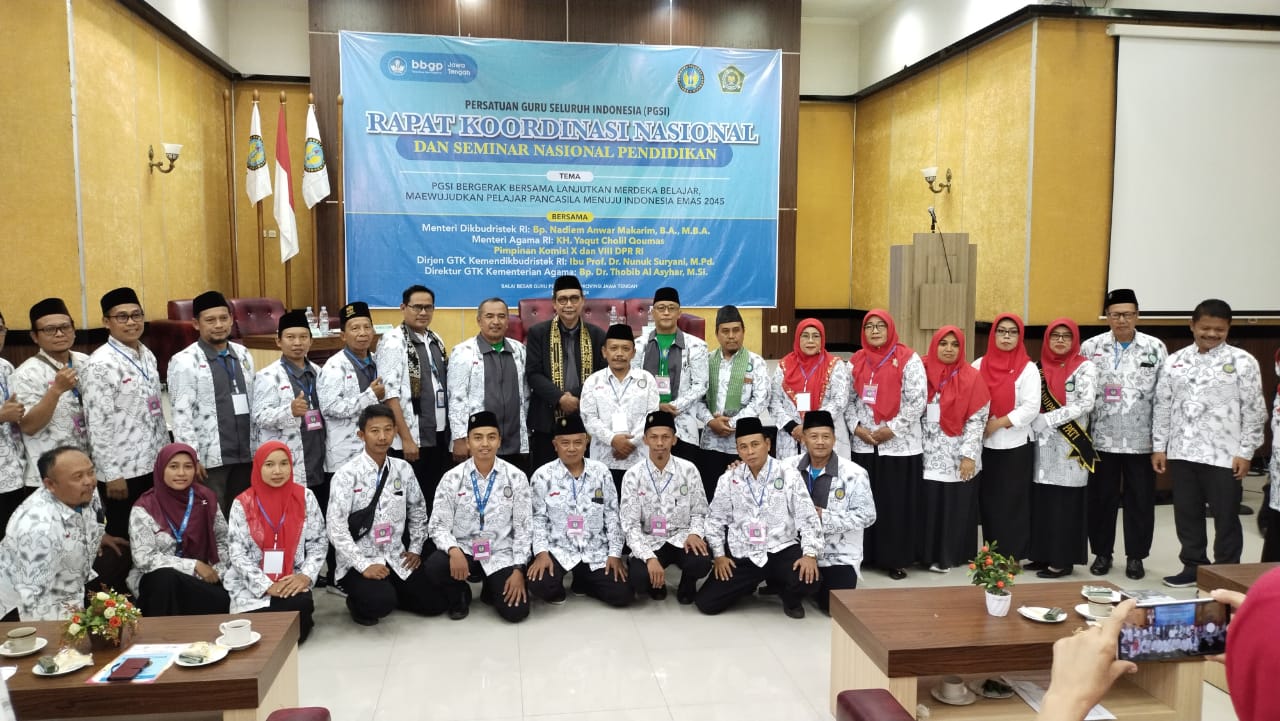 Turut hadir, Ketua PGSI Kabupaten Demak, Noor Salim, beserta jajaran pengurus PGSI Demak dan rombongan, secara serius mengikuti rangkaian Rakornas dan Seminar Nasional Pendidikan dengan narasumber Kasubdit GTK Kemenag RI, Dr. Suwardi, Kepala BBGP Jawa Tengah, Darmadi, M.Pd, serta H. Muh Zeen, Adv. S.Ag, M.Si, Pembina PB. PGSI.