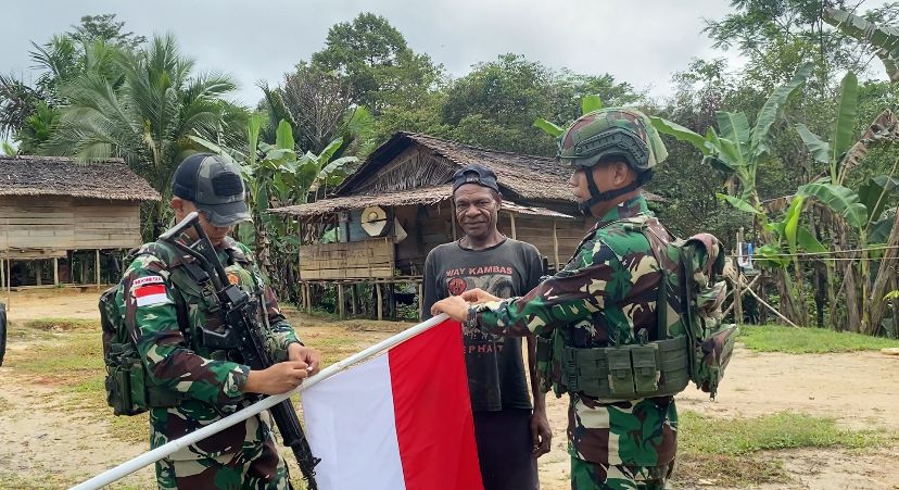 Tak hanya sekadar berbagi, personel Satgas juga turun langsung membantu warga memasang bendera di depan rumah, menghiasi kampung dengan nuansa merah putih yang semarak. Anak-anak pun terlihat antusias menerima bingkisan biskuit dan madu yang dibagikan sambil tersenyum bahagia.