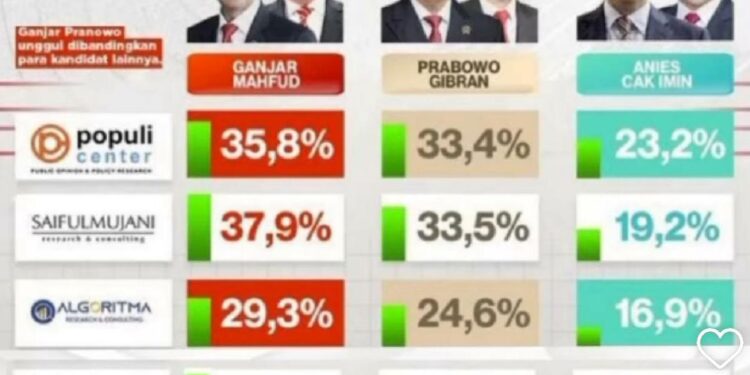 Jakarta – bedanews.com – Elektabilitas pasangan Capres-Cawapres Partai Demokrasi Indonesia Perjuangan (PDIP), Ganjar Pranowo-Mahfud MD menunjukkan hasil tertinggi dibandingkan dua pasangan lain, Prabowo Subianto-Gibran Rakabuming Raka dan Anies Baswedan-Muhaimin Iskandar.