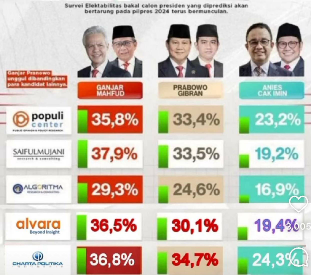 Charta Politica merilis hasil survei yang menunjukkan pasangan Ganjar-Mahfud mendapatkan hasil 36,8 persen, sementara Prabowo-Gibran ada di angka 34,7 persen. Pasangan Anies-Muhaimin berada di peringkat buncit dengan 24,4 persen.